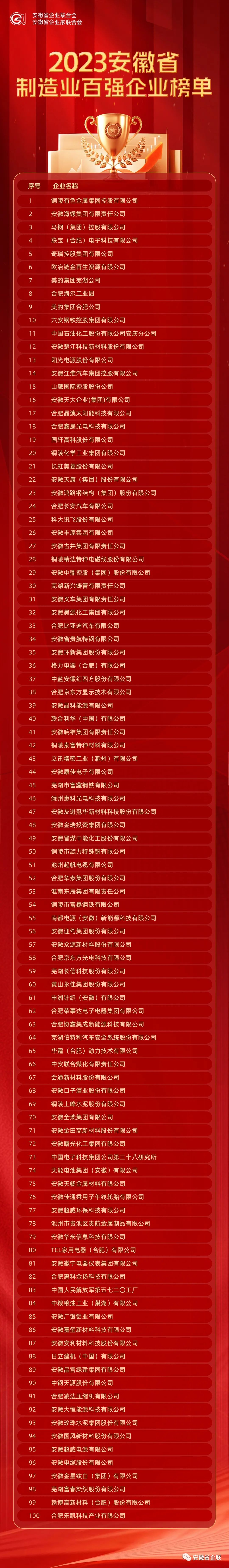 為全面貫徹習(xí)近平新時代中國特色社會主義思想和黨的二十大精神,著力推動我省企業(yè)高質(zhì)量發(fā)展,促進(jìn)企業(yè)做強(qiáng)做優(yōu)做大,并為社會各界提供安徽大企業(yè)發(fā)展的數(shù)據(jù)信息,今年,我會連續(xù)第十九次在全省開展了安徽企業(yè)100強(qiáng)申報排序活動。根據(jù)企業(yè)自愿申報,有關(guān)機(jī)構(gòu)確認(rèn),以2022年企業(yè)營業(yè)收入為標(biāo)準(zhǔn),經(jīng)審定,確定了安徽企業(yè)綜合100強(qiáng)和制造業(yè)、服務(wù)業(yè)企業(yè)100強(qiáng)。現(xiàn)將名單予以公布(詳見附件)。2022年,面對風(fēng)高浪急的國際環(huán)境和艱巨繁重的發(fā)展穩(wěn)定任務(wù),安徽大企業(yè)迎難而上,全面落實疫情要防住、經(jīng)濟(jì)要穩(wěn)住、發(fā)展要安全的要求,實現(xiàn)了企業(yè)運行平穩(wěn)、質(zhì)量穩(wěn)步提升、社會貢獻(xiàn)度持續(xù)增長,取得了來之不易的新成就。安徽百強(qiáng)企業(yè)入圍門檻繼續(xù)提升,經(jīng)營規(guī)模快速增長,國際化經(jīng)營成效顯著,資產(chǎn)總額首次突破4萬億元,進(jìn)一步鞏固了大企業(yè)在市場競爭中的領(lǐng)先地位。希望安徽百強(qiáng)企業(yè)認(rèn)真貫徹落實黨的二十大精神,立足中國式現(xiàn)代化全局謀劃自身發(fā)展,積極投身我省“三地一區(qū)”和“七個強(qiáng)省”建設(shè),堅持高質(zhì)量發(fā)展方向,著力提升核心競爭力,為建設(shè)現(xiàn)代化美好安徽做出更大的貢獻(xiàn)。
