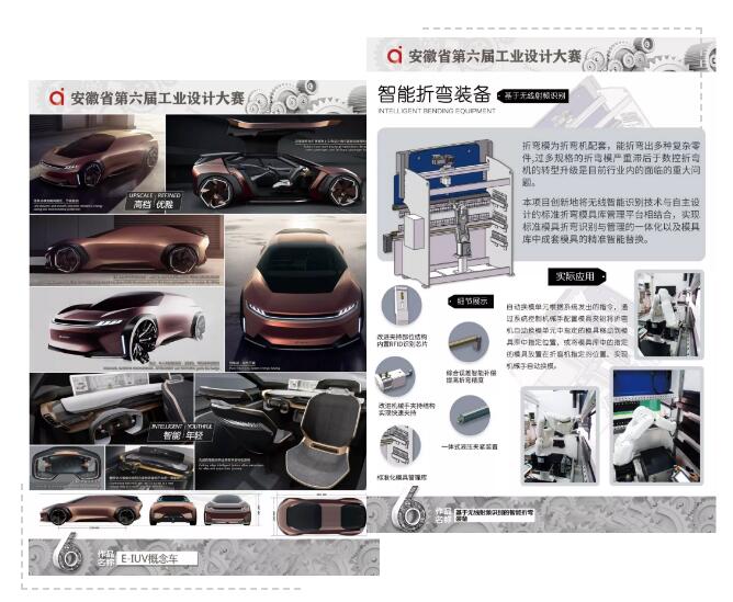 最終,來(lái)自奇瑞汽車的E-IUV概念車(概念設(shè)計(jì))與安徽聯(lián)盟模具工業(yè)有限公司的基于無(wú)線射頻識(shí)別的智能折彎裝備( 實(shí)物產(chǎn)品)榮獲本次大賽金獎(jiǎng),從設(shè)計(jì)理念、產(chǎn)品外形、先進(jìn)技術(shù)在產(chǎn)品中的應(yīng)用以及解決行業(yè)痛點(diǎn)等關(guān)鍵問(wèn)題上,以上作品在行業(yè)中均處于領(lǐng)先水平。同時(shí),來(lái)自順榮股份、三只松鼠、美的冰箱、中車龐巴迪(蕪湖)、安徽工程大學(xué)、安徽工業(yè)大學(xué)等企業(yè)、高校投稿作品也在本次大賽中取得了優(yōu)異的成績(jī)。