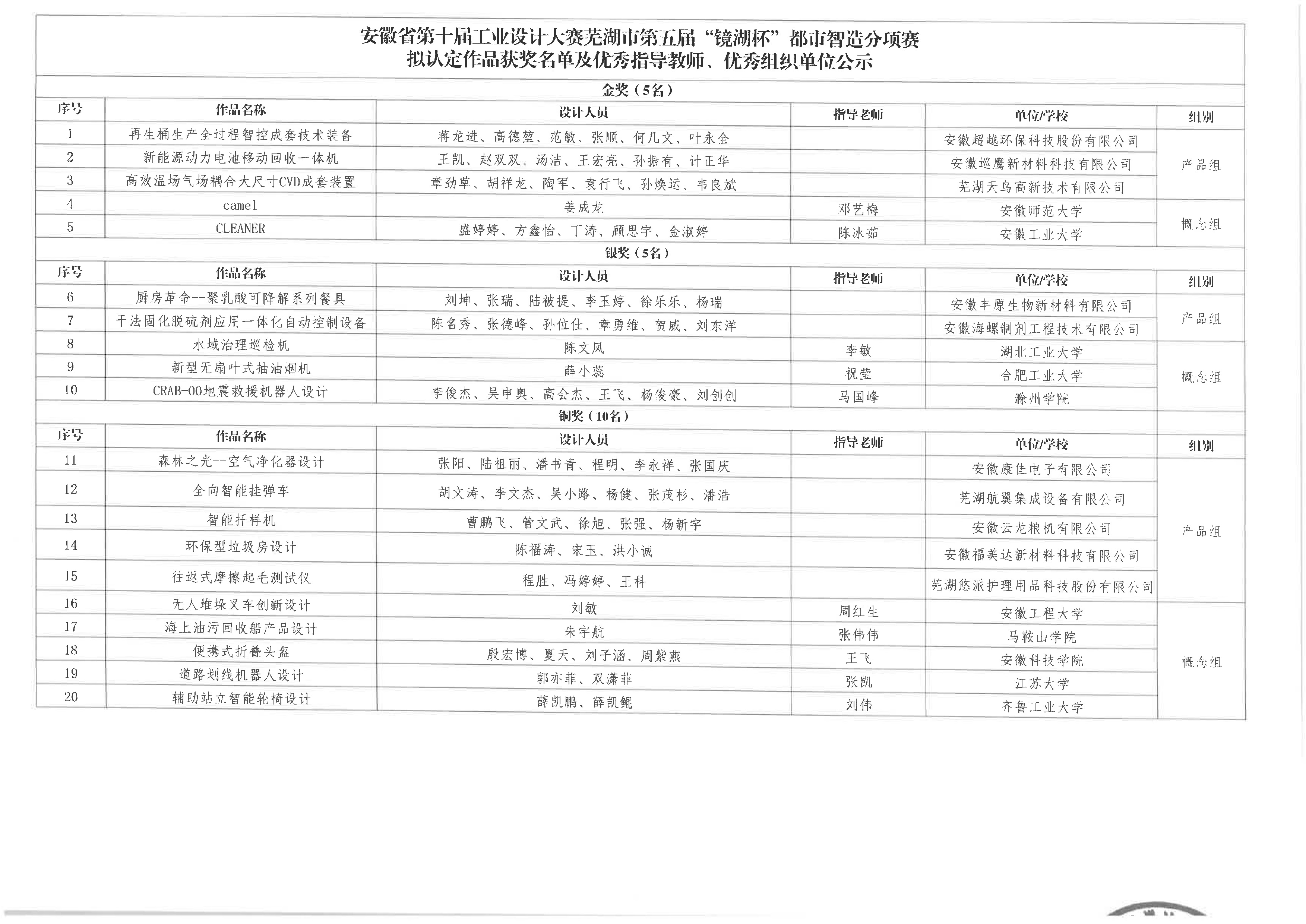 關于安徽省第十屆工業設計大賽蕪湖市第五屆“鏡湖杯”都市智造分項賽擬認定作品獲獎名單及優秀指導教師、優秀組織單位的公示